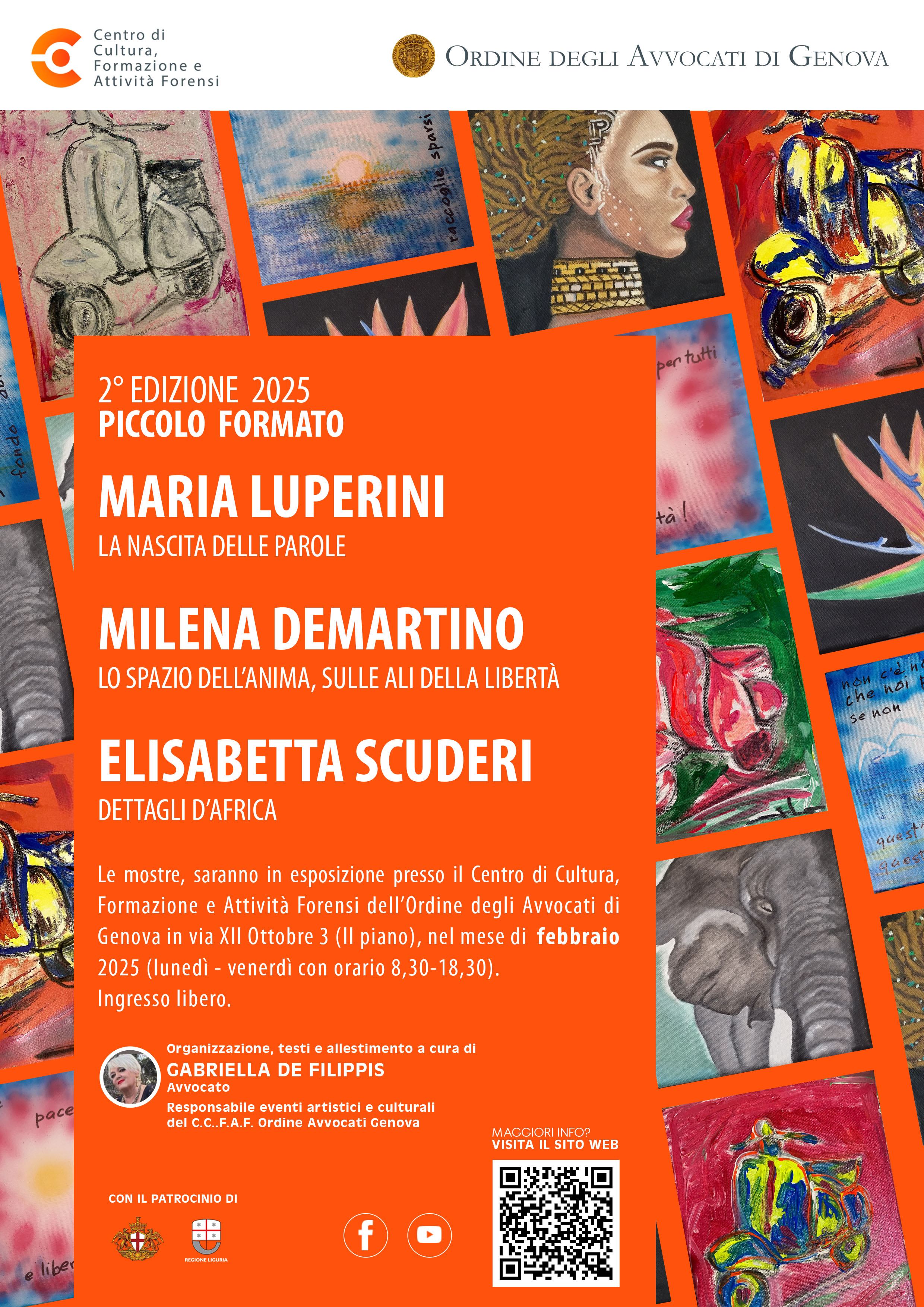 Secondo appuntamento a febbraio 2025 per la RASSEGNA DEL PICCOLO FORMATO, esposizione di opere di diverse dimensioni, ma non superiori a 30 x 30 cm che ogni mese ospita, nei locali del Centro Cultura Formazione e Attività Forensi, in via XII ottobre 3, le opere di diversi noti artisti prevalentemente genovesi.