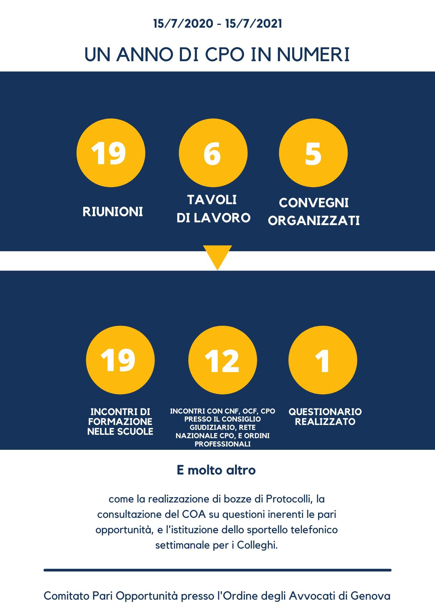 Ha svolto 19 riunioni, 6 tavoli, 12 incontri con CNF, OCF, CPO presso il Consiglio Giudiziario, Rete Nazionale CPO e Ordini Professionali e ha relizzato molto altro come la creazione di un questionario e l'istituzione di uno sportello telefonico settimnale per tutti gli iscritti all'Ordine degli Avvocati di Genova