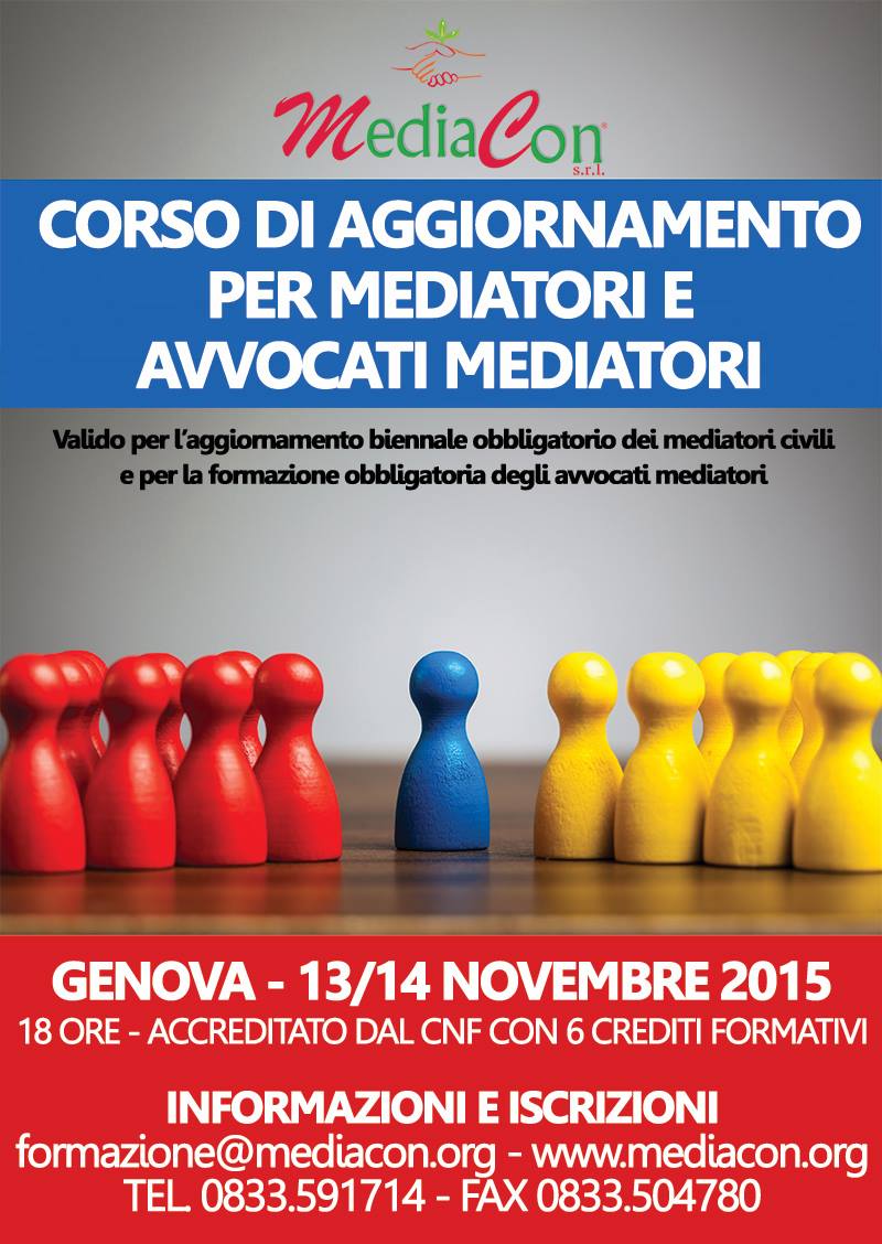 -"Corso di aggiornamento per mediatori ed avvocati mediatori” (durata-18 ore) –Genova –13-14 novembre.