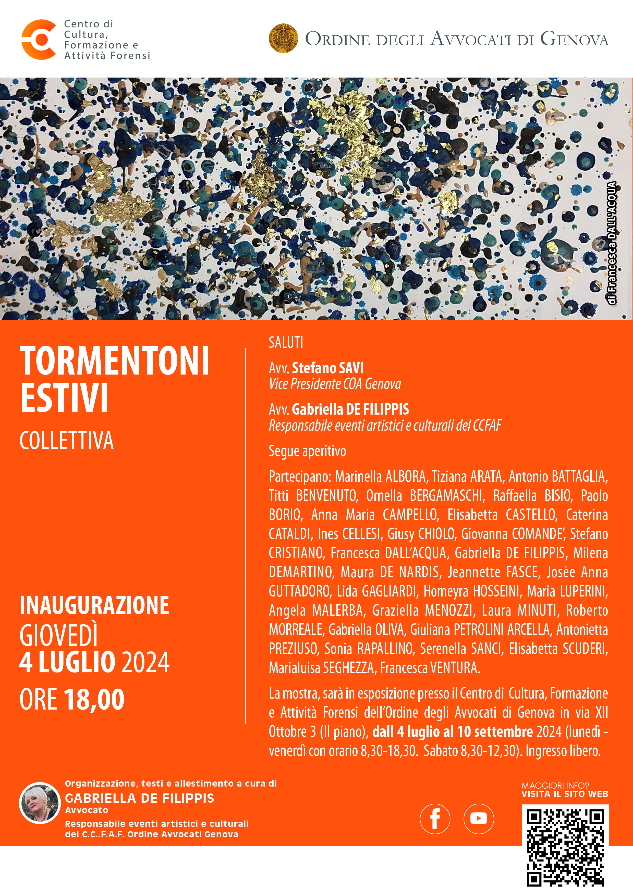Giovedì 4 luglio 2024, alle ore 18,00, nei locali del Centro Cultura Formazione e Attività Forensi, in via XII ottobre 3, sarà inaugurata la mostra dal titolo TORMENTONI ESTIVI, alla quale hanno partecipato circa 35 artisti.