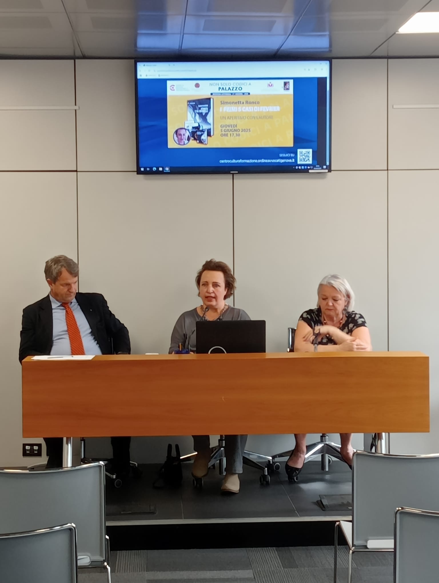 Per la RASSEGNA LETTERARIA NON SOLO CODICI A PALAZZO, nelle due versioni UN TE’ CON L’AUTORE (in biblioteca) e UN APERITIVO CON L’AUTORE (nella sala piccola del Centro Cultura) abbiamo presentato( in biblioteca) il libro di Chiara Atzeni (ESODO ) con un breve intervento giuridico tenuto dalla sottoscritta dal titolo “Dalla riduzione e restituzione dei cognomi all’attuale normativa sul cambio dei cognomi “ , con intermezzi musicali alla chitarra eseguiti dalla autrice del libro e dal chitarrista Ignazio Serventi, e il libro di Federica Storace, (BY BY AMORE MIO ) con un intervento giuridico del collega Raffaele Caruso dal titolo “I risvolti giuridici del disagio giovanile “ , mentre nella sala del Centro Cultura abbiamo parlato del libro del comico Marco Rinaldi, ( MUGUGNO IN VAL SERVAEGA ) con la partecipazione della psicologa Elena Bormida , di quello del fotografo Gianni Ansaldi (RITRATTI PER UNA INDAGINE) con la partecipazione della collega Alberta Frondoni. Poi è stata la volta del libro scritto dal pianista jazz Carlo Milanese (LUCKY'S MOOD) che, coadiuvato dal noto batterista Rodolfo Cervetto e dal contrabbassista Riccardo Barbera ha tenuto anche un mini concerto jazz, del libro giallo di Giorgio Vitari, ex Avvocato Generale presso la Corte di Appello di Genova (IL PROCURATORE, LA CACCIA E LA PREDA ) con gli interventi della dott.ssa Nicoletta Guerrero , magistrato presso l’ufficio GIP del nostro Tribunale, e della collega Roberta Barbanera, Presidente del nostro CDD, con una relazione sui “Doveri deontologici degli Avvocati ”. Inoltre abbiamo presentato il libro di Paola Zagarella (VILLA PONENTE) con l’intervento del Collega Consigliere del CDD Alberto Figone, che ci ha parlato del “Rapporto tra genitori e figli e della responsabilità genitoriale . Infine, con l’intervento della sottoscritta e del Collega Consigliere Paolo Bonanni, che ci ha intrattenuto sul tema delle “ Indagini difensive “ abbiamo presentato i -per ora- cinque libri scritti da Simonetta Ronco e dedicati al pianista investigatore Audemars Fevrier ( I PRIMI CINQUE CASI DI FEVRIER)