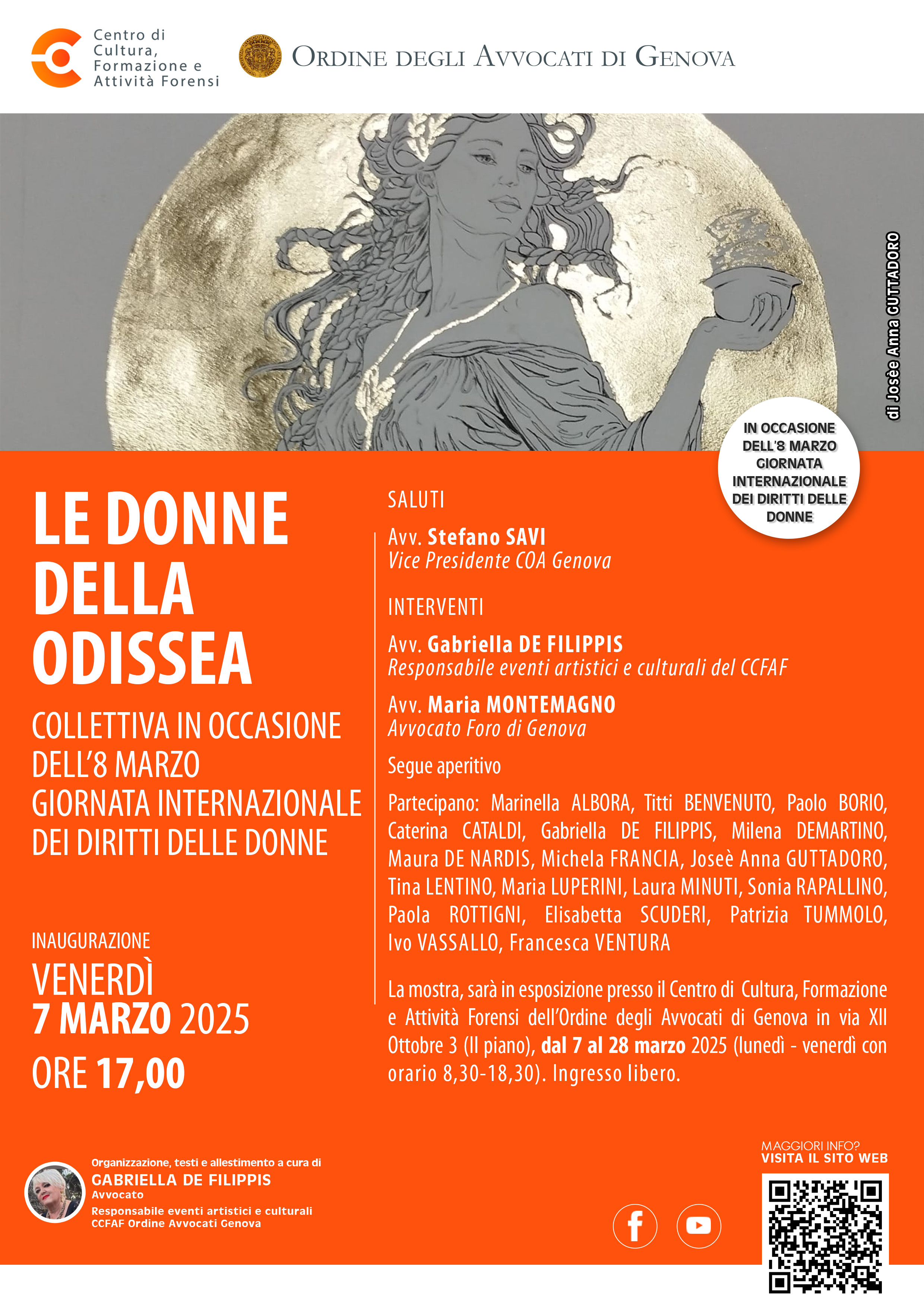 In occasione dell’8 marzo, giornata internazionale della donna, venerdì 7 marzo 2025, alle ore 17,30 nei locali del Centro Cultura Formazione e Attività Forensi, in via XII ottobre 3, sarà inaugurata la mostra dal titolo LE DONNE DELLA ODISSEA, collettiva di arti varie alla quale hanno partecipato una ventina di artisti prevalentemente liguri.