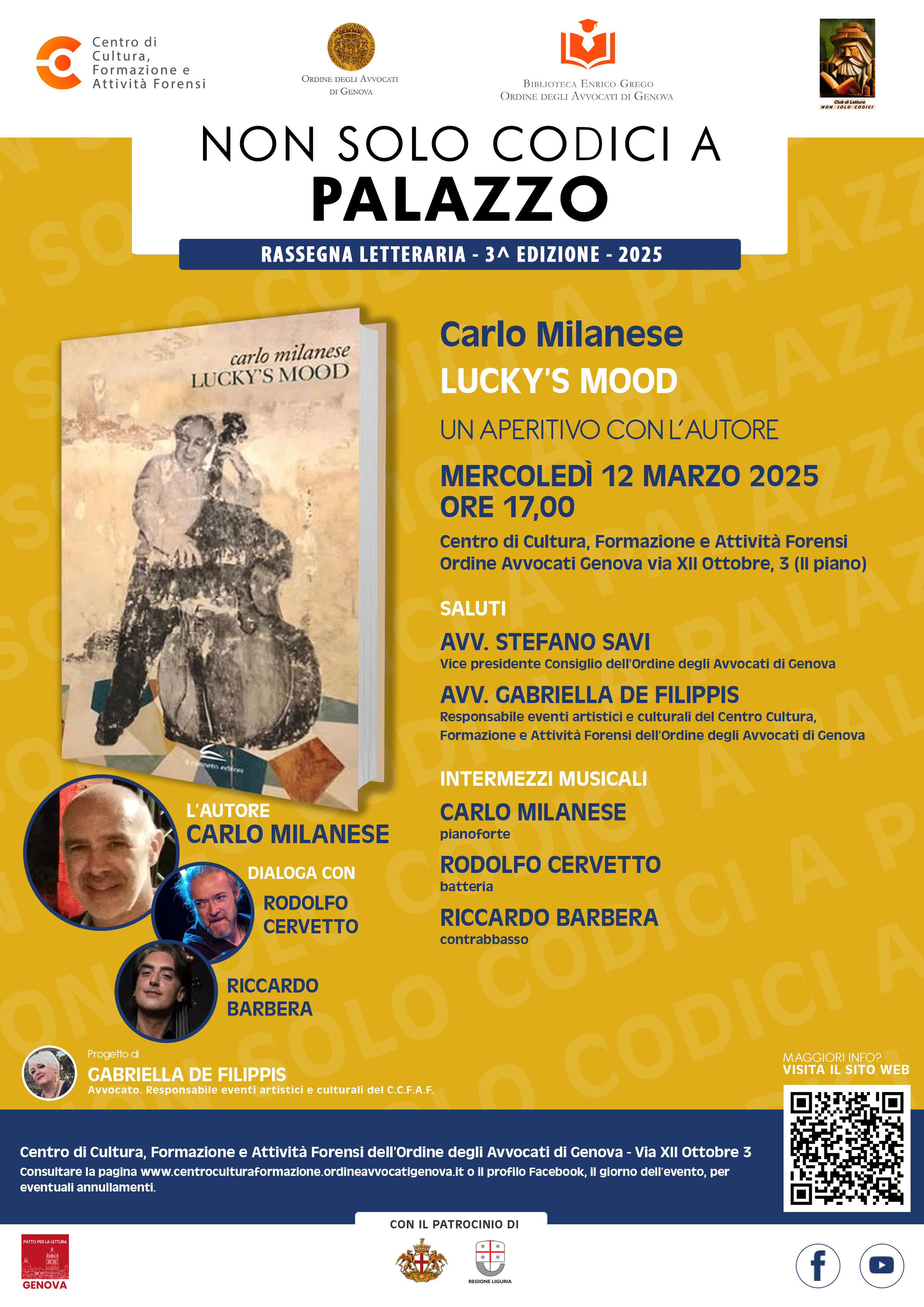 Mercoledì 12 marzo 2025, alle ore 17,00, nei locali del Centro Cultura Formazione e Attività Forensi, in Genova, via XII ottobre 3, si terrà un altro incontro nell’ambito della III edizione della Rassegna Letteraria NON SOLO CODICI A PALAZZO-UN APERITIVO CON L’AUTORE, che prevede incontri da tenersi indicativamente una volta al mese, alla presenza di uno scrittore di libri di narrativa, di gialli o di saggistica.