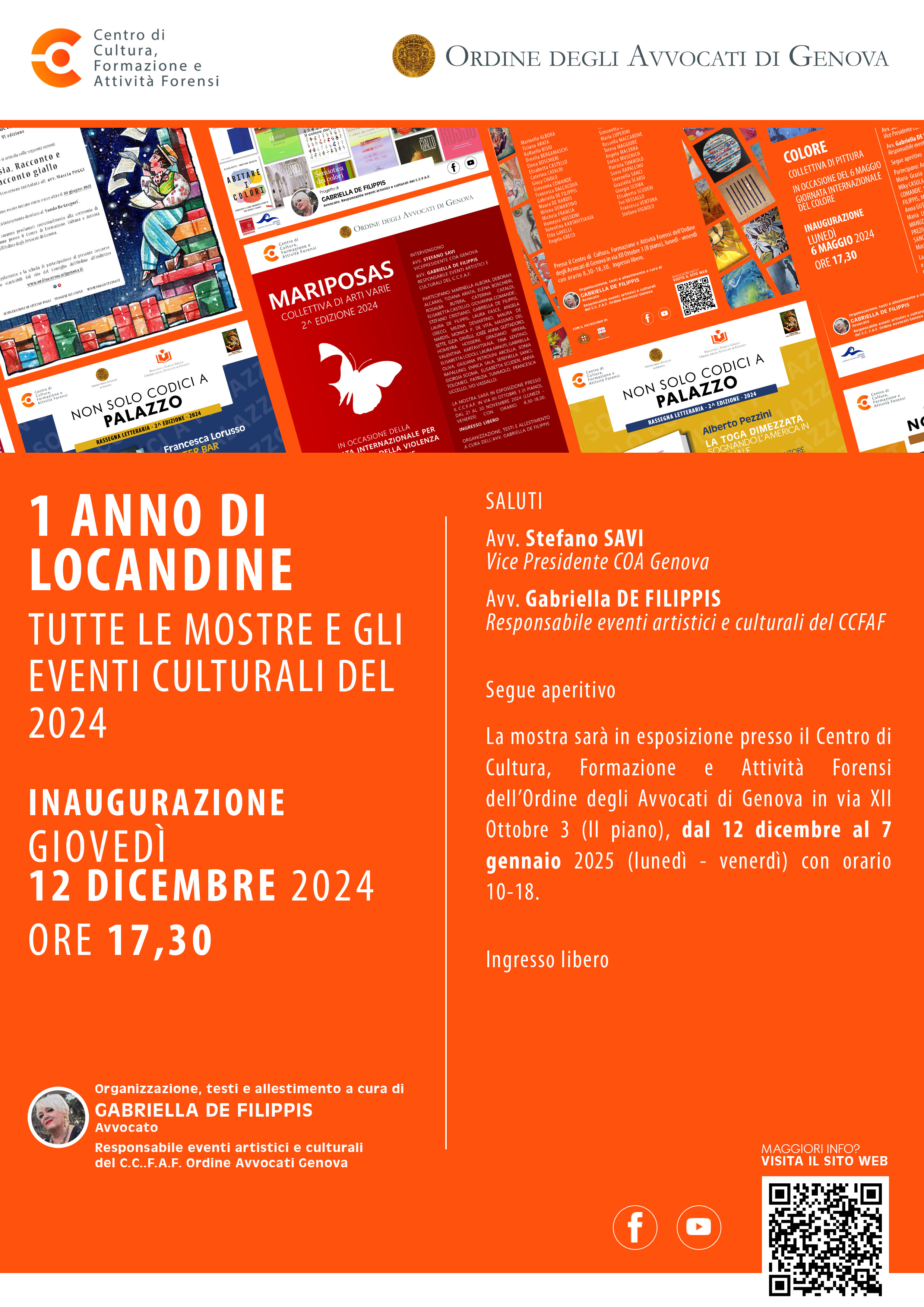 La mostra sarà in esposizione presso il Centro di Cultura, Formazione e Attività Forensi dell’Ordine degli Avvocati di Genova in via XII Ottobre 3 (II piano), dal 12 dicembre al 7 gennaio 2025 (lunedì - venerdì) con orario 10-18.