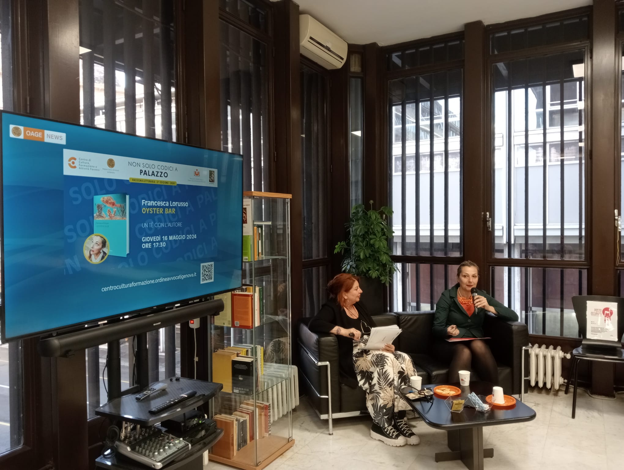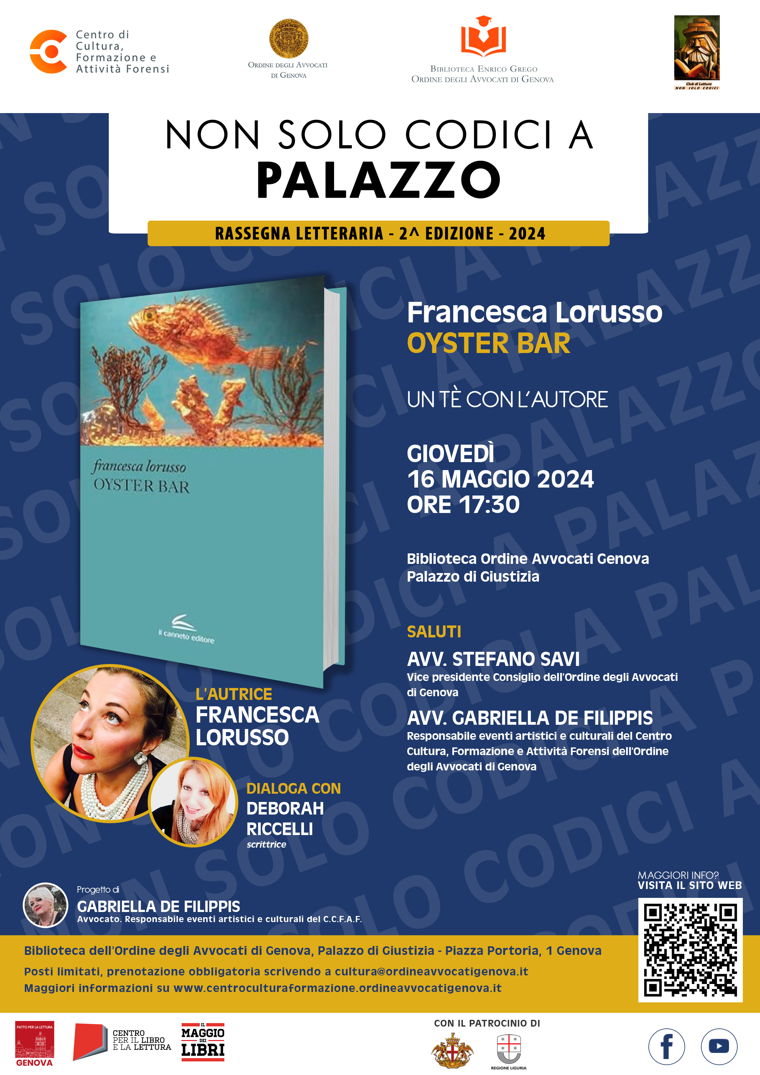 Il 16 maggio 2024, alle ore 17,30, nei locali della Biblioteca Enrico Grego sita all’interno della sede principale dell’Ordine degli Avvocati di Genova, presso il Palazzo di giustizia, si terrà un altro incontro della seconda edizione della Rassegna letteraria dal titolo Non solo Codici a Palazzo - Un tè con l’autore, incontri che si tengono, indicativamente, una volta al mese, alla presenza di uno scrittore di libri prevalentemente di narrativa.