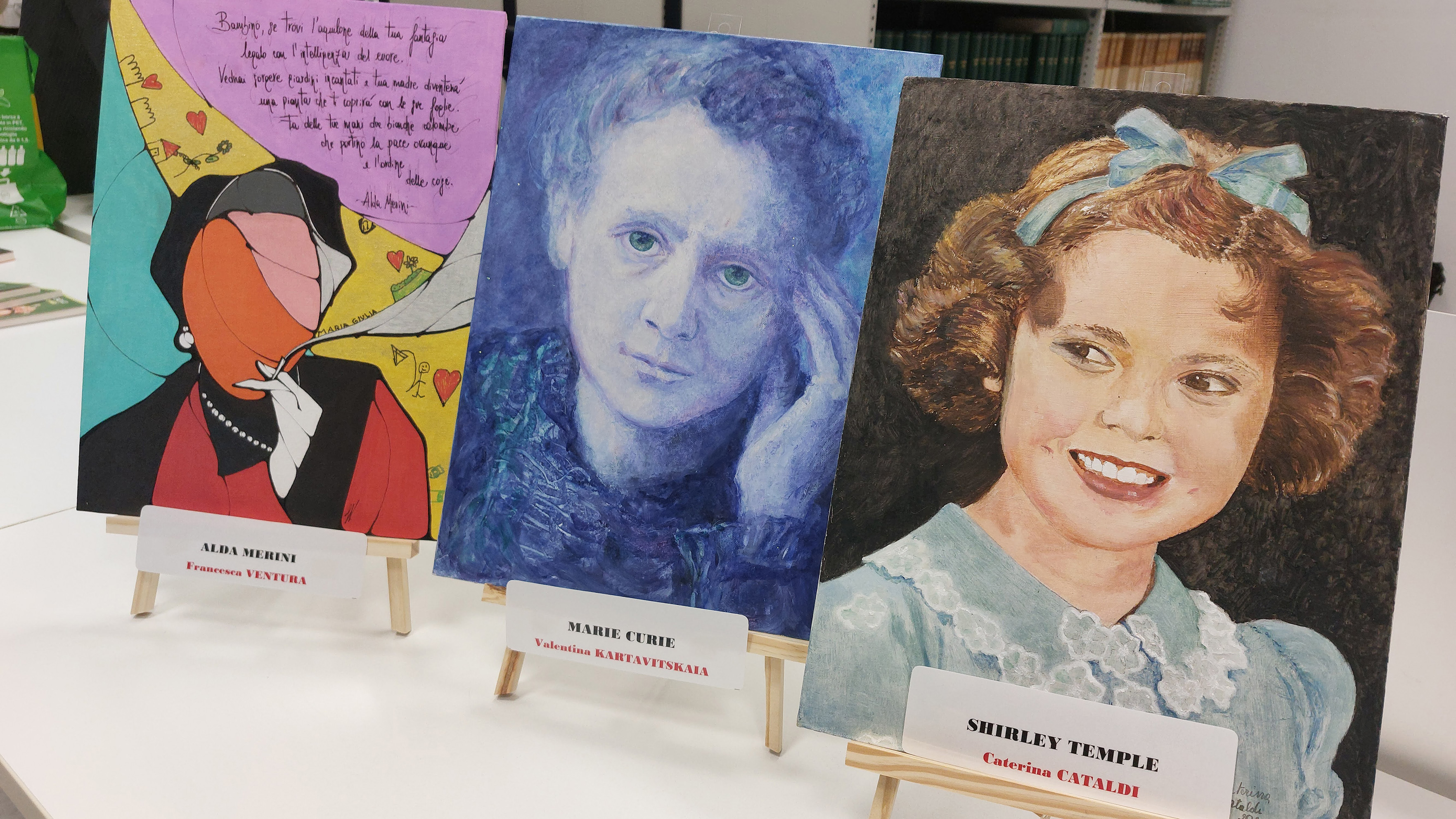 Le artiste che dipingeranno i ritratti di queste quattro donne saranno, nell’ordine, Valentina Kartavitskaia, (Marie Curie), Francesca Ventura (Alda Merini), Gabriella de Filippis (Frida Kahlo) e Caterina Cataldi (Shirley Temple)