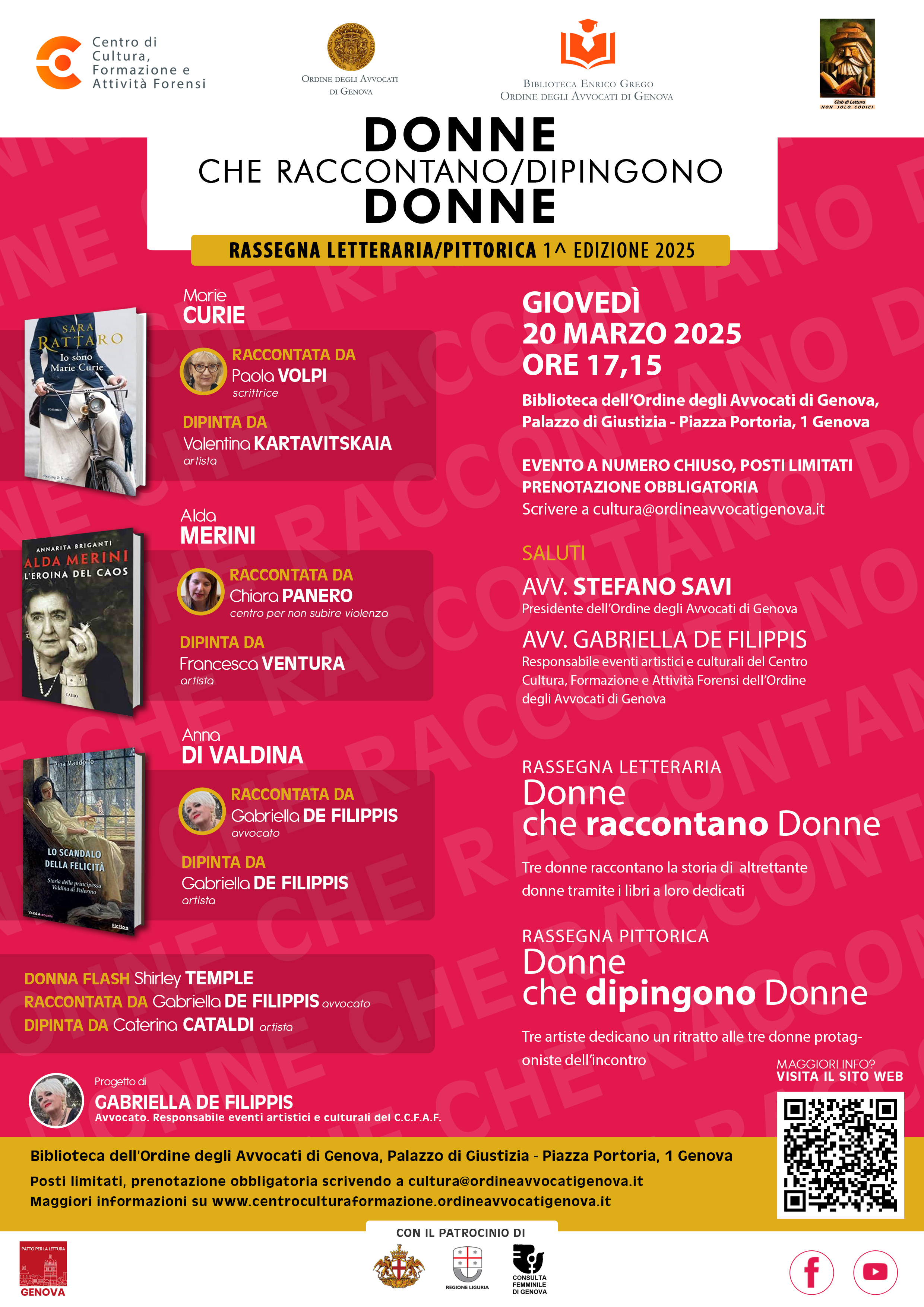 Per quanto riguarda più specificatamente l’incontro di questo prossimo 20 marzo, che, come si è detto, si terrà nei locali della Biblioteca E. Grego , sita all’interno dell’Ordine degli Avvocati di Genova, a sua volta ubicata dentro Palazzo di Giustizia, in Piazza Portoria 1, alle ore 17,15 le tre professioniste che presenteranno la biografia delle donne famose scelte per questa occasione saranno Paola Volpi, scrittrice, che ci parlerà di Marie Curie, fisica, matematica e chimica polacca, prima donna a ricevere il premio Nobel , Chiara Panero, del Centro per non subire violenza, che ci parlerà di Alda Merini, una tra le più grandi poetesse italiane dell’era moderna, e infine l’avv. Gabriella de Filippis, ci racconterà la vita di Anna di Valdina, figlia del Principe di Valdina che nel 1600 venne costretta dal padre a diventare monaca e che per circa cinquant’anni ha lottato in tuti i modi per farsi sciogliere dai voti e tornare alla vita da laica, finalmente riuscendo nel suo intento pochi anni prima della sua morte.