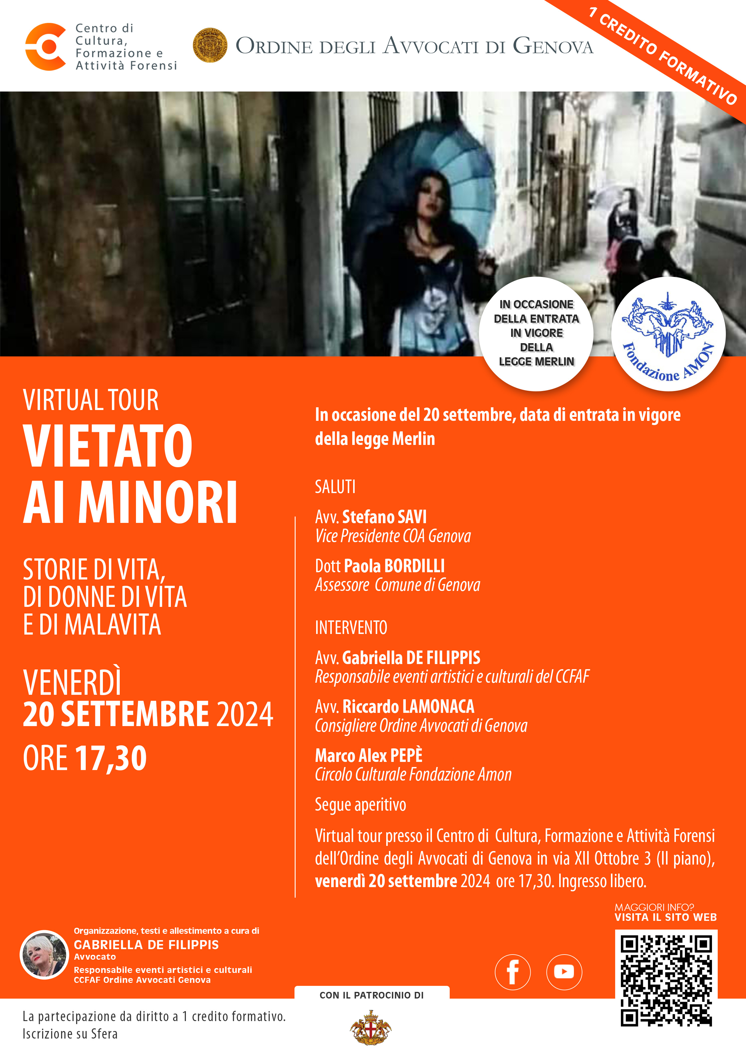 In occasione del 20 settembre, data di entrata in vigore della “legge Merlin” alle ore 17,30 di venerdì 20 settembre 2024 , nei locali del Centro Cultura Formazione e Attività Forensi, in via XII ottobre 3, si potrà assistere al VIRTUAL TOUR dal titolo VIETATO AI MINORI- Storie di vita, di donne di vita e di malavita, realizzato in collaborazione con la associazione culturale Fondazione Amon