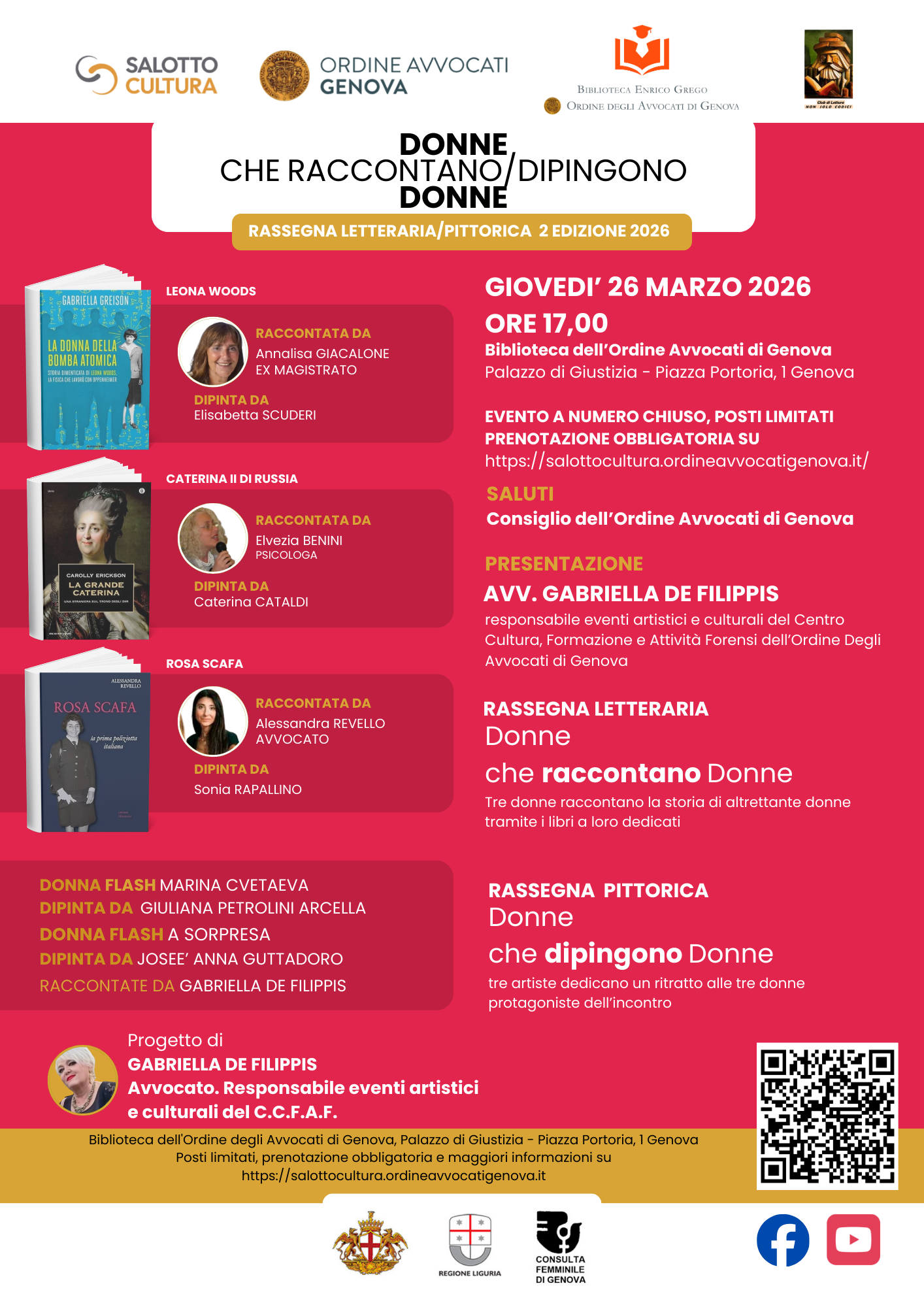 “Donne che raccontano / dipingono donne” con un nuovo appuntamento in programma giovedì 26 marzo 2026 alle ore 17.00 nei locali della Biblioteca E. Grego dell’Ordine degli Avvocati di Genova, presso Palazzo di Giustizia, Piazza Portoria 1, Genova.