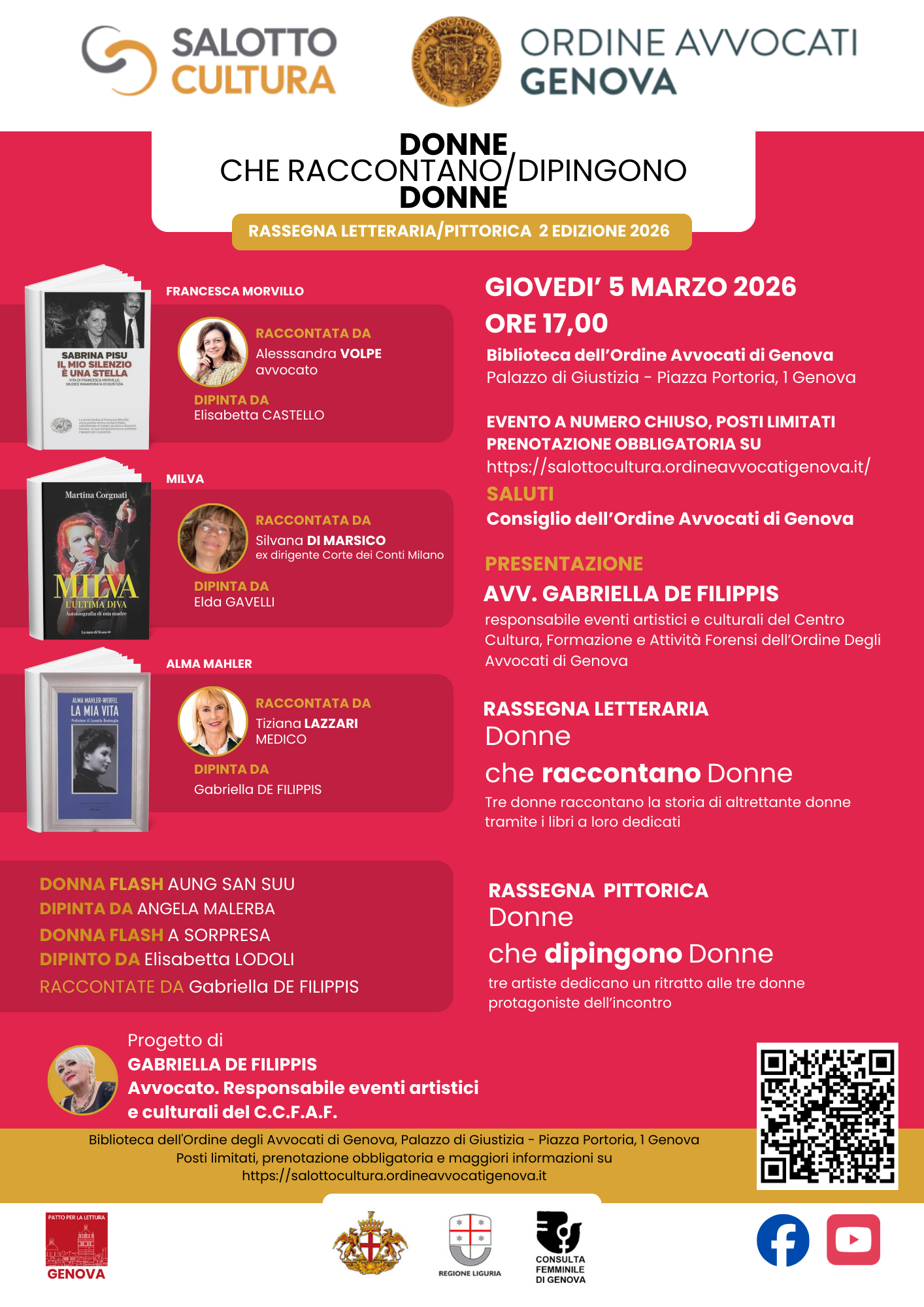 Come di consueto, la rassegna si concluderà con la “Donna flash”, biografia lampo raccontata in pochi minuti dall’ideatrice del progetto, avv. Gabriella de Filippis, responsabile degli eventi artistici e culturali del Centro Cultura dell’Ordine degli Avvocati di Genova.